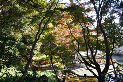 「薬草園、花木園、生垣園」と書かれている方へ歩いていくと、そこは木漏れ日の遊歩道。緩やかな上り坂だが、緑の間でほんのり色付いているモミジに癒される。
