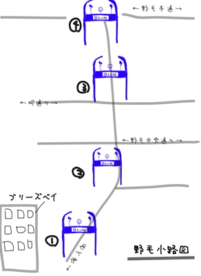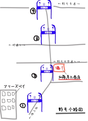 野毛小路図。①~④まで、4基のアーチが設置されている