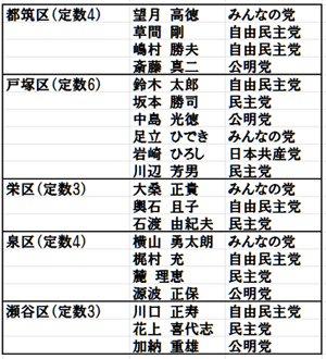 横浜市会の議員定数は86で、下図のとおり各区から選出されている。