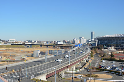 鶴見川流域センターの屋上から。日産スタジアムのほか、野球場なども