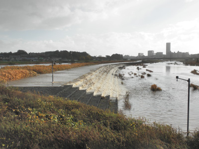 いざというときは、堤防のうち“越流堤(えつりゅうてい)”と呼ばれる意図的に低く造られた部分から水を流し込むことになる。