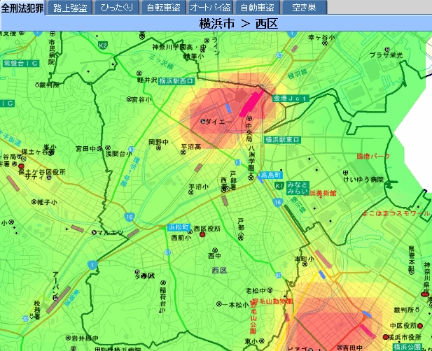 確かに、神奈川県警が提供している「2010年 街頭犯罪等発生マップ」を見ても、横浜駅や関内駅周辺に犯罪発生数が多いことがわかる。