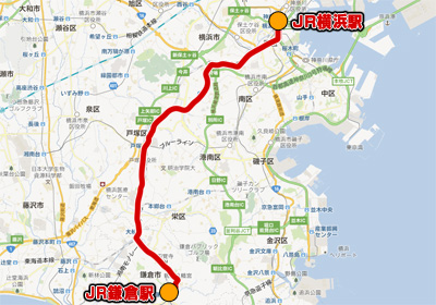 横浜~鎌倉間を走る今回のルート(Googleマップより)