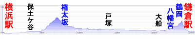 出発は横浜駅前。国道1号に沿って保土ケ谷方面に向かい、戸塚駅から柏尾川沿いのプロムナードを南下。大船駅から県道21号に入り、北鎌倉駅前を通過して鶴岡八幡宮、鎌倉駅を目指す。距離は約25km。鶴岡八幡宮の東側は起伏が大きいため、西側からまわりこむイメージだ。