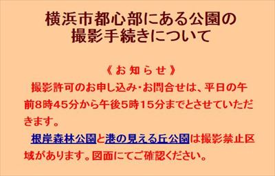 そこで横浜市環境創造局のサイト内を「撮影禁止」という単語で検索。すると「横浜市都心部にある公園の撮影手続き」というページがヒット。撮影禁止区域の存在を知らないと、このページには来られない気がするが、ともかくページ内をあれこれクリック。