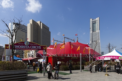 みなとみらい線の馬車道駅前、横浜アイランドタワー横にある大きな赤いテント。ここが木下大サーカスの会場だ。JR桜木町駅寄りの入口に、トラのマークが書いてあるのが目印。