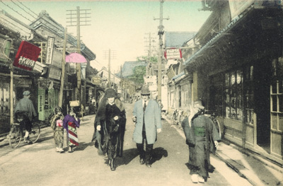 当時の元町の様子、右手奥の赤い看板に「FUJIYA」の文字が見える