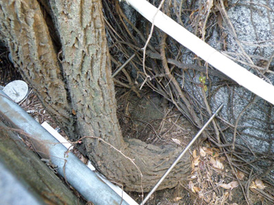 建物に向かって左側、隣のビルとの間にできた隙間に案内してくださったのは、同店秘書の西鳥羽さんと、店長の土田さん。「この1本の根元から、建物すべてに伸びていると聞いています」と話す。