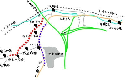 青の破線は国道1号沿線の権太坂、赤の破線は旧東海道上の権太坂