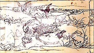 「九相図 下絵」(画像提供:河鍋暁斎記念美術館)。鳥が遺体をつついている