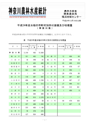神奈川県の平成24年産市町村別水稲の作付面積及び収穫量