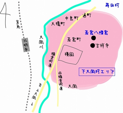 ピンク色で囲った部分が下大岡村エリア