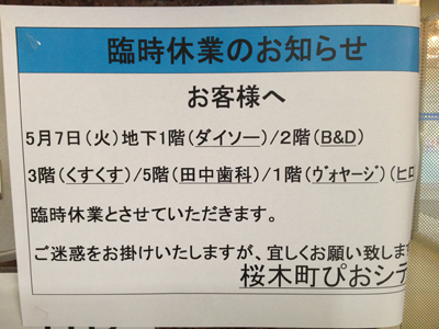 地下1階へ降りてみると、100円ショップのダイソーは張り紙のとおり休業中。たまたま商品を片付けていた店員に話を伺ったところ、5月8日から営業を再開するそう。