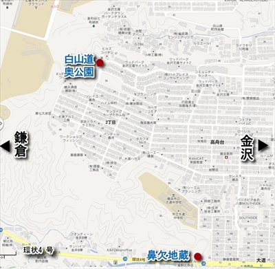 「鼻欠地蔵」と白山道奥公園の位置関係(Googleマップより)