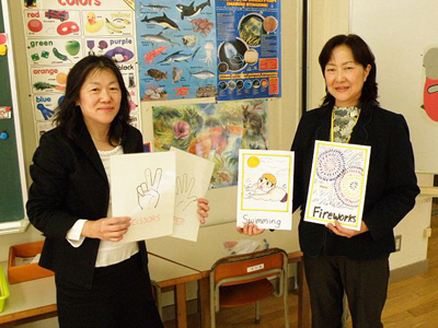 お手製の英語教材を手に、三浦先生(右)と海老名先生(左)