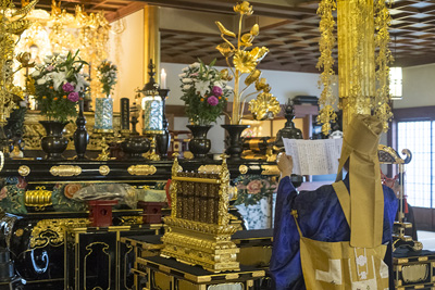 光明寺は旧・小田原御用邸の御学問所を移築した書院を持つ、由緒あるお寺。本堂に掲げられた寄進の額には、「横濱食鳥鶏卵川魚商業協同組合」と記され、こうした供養を昔から行っていることをうかがわせる。