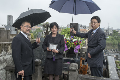 墓前で創業者である米さんの遺影を持つ総店長の葛西さん