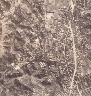 1956(昭和31)年、横浜市撮影の上大岡近辺の航空写真(出典:港南歴史協議会)