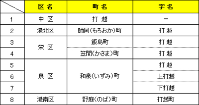 「打越」を含む地名は、市内にこれだけある
