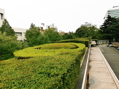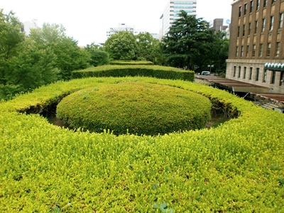 「水面の波紋を思わせる模様で、無限の広がりを表現」しているそうだ。また複数の種類の植物を植えているので、四季折々の変化を楽しめる。植えられているものはハマヒサカキ、サツキ、ボックスウッドに高麗芝。きれいな緑や、季節ごとの彩りを演出してくれる。