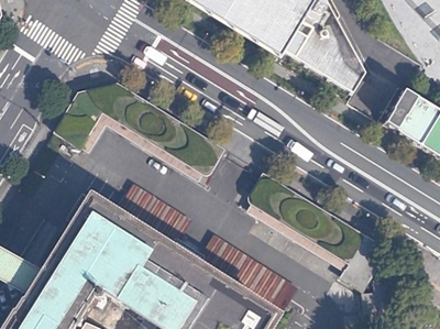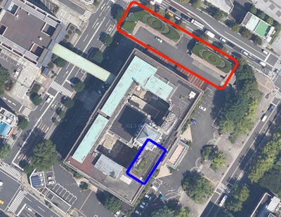 今回の投稿にあるのは赤枠の部分。本庁舎北側にある車庫の屋上だ。