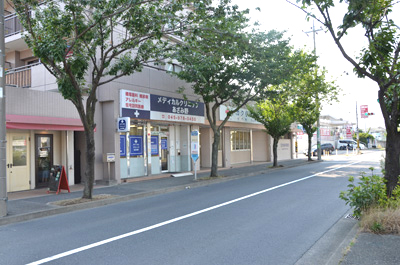 お店が並んでいる。カメラの背後にコンビニと郵便局が