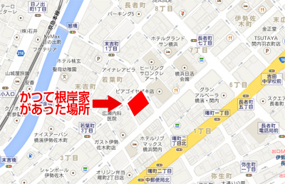 根岸家はどこにあったのか。場所は現在の中区若葉町である。イセザキモールに入り、ピアゴを過ぎて右に曲がったところにある広い駐車場が、かつてNEGISHIYAと書かれた建物のあった敷地である。いまは、根岸家は影も形もない。