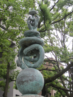 場所は大通り公園にあり、てっぺんにある不思議な形をしたオブジェが目を引く。これは古代中国殷(いん)時代の金文を立体構成したものであり、「愛をもって世界の平和を祈念する」という意味であるという。