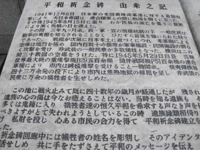 (中略)横浜はこの間三十数回の空爆をうけた。特に1945年5月29日白昼 当時世界最大級の重爆撃機B29五百余機 随伴戦闘機P51百余機の連合軍機により 市内は絨毯爆撃を受けること一時間余。焼夷弾換算四十三万余発の投下により市内は焦熱地獄の様相を呈し 非武装の民衆に万余の犠牲者を生ぜしめた。