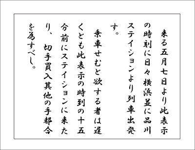 1872(明治5)年5月4日(旧暦)、工部省(明治政府が設置した官庁で、殖産興業の発展を目的とした)は、ある文書を品川と横浜(現・桜木町)の両駅に掲出した。