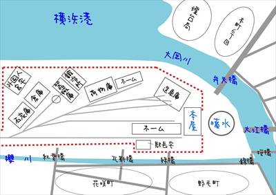 さて、現・桜木町駅とほぼ同じ位置に存在したといわれる初代横浜駅であるが、実際には、駅本屋はより大岡川に近い位置にあった。