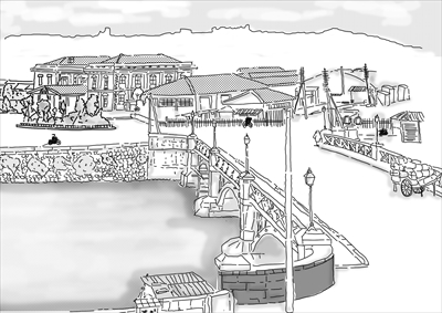 明治初期の弁天橋。左奥が本屋。川沿いに屋台や人力車(再現イラスト:ナリタノゾミ)
