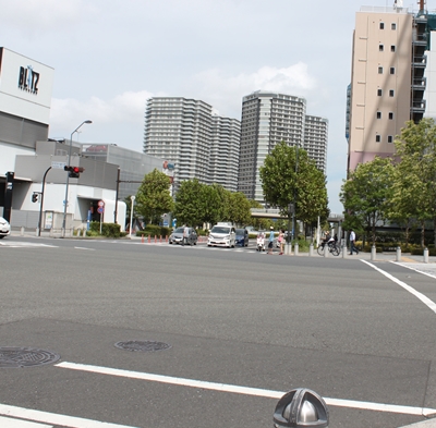 「すずかけ通り西」の交差点から海の方向を見ると、そば屋さんは街路樹に隠れて見えにくいが、マンションは良く見える。