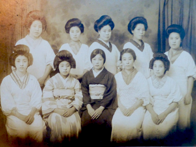 中央の黒っぽい着物の人が和田さんのお母さん。全員違う型の日本髪を結ったお弟子さんたちに囲まれている。かなり貴重な写真だ。