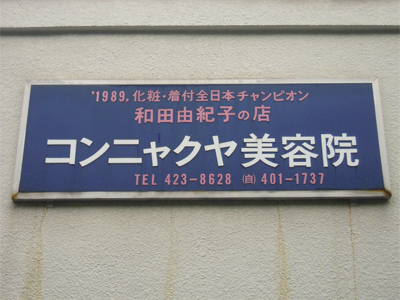 店の看板。「化粧・着付全日本チャンピオン 和田由紀子の店」とある