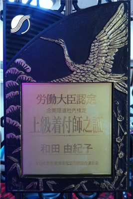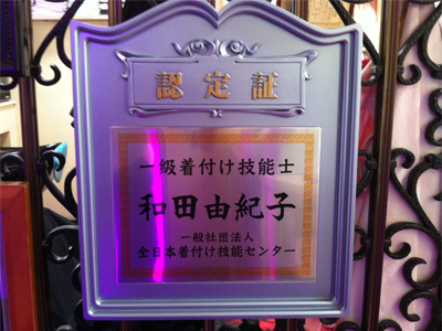 店内入り口に飾ってあった「一級着付け技能士」の認定証