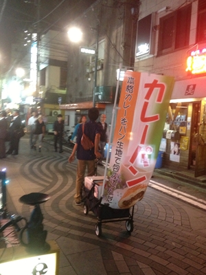 この人なのか? いや、しかし、投稿には「女の人がスイーツ」とある。ところが、目の前に現れたのは「カレーパンマン」・・・。もとい、「カレーパンを台車で引く男性」。いくら最寄駅が桜木町で、アンパンマンミュージアムが近くにあるからと言っても・・・。