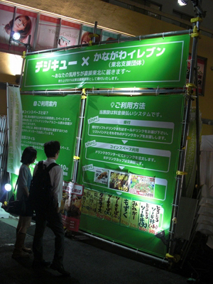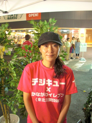 看板には「『デジキュー』×『かながわイレブン(東北支援団体)』~あなたの気持ちが直接東北に届きます~」と記載されている。それでは、このイベントを主催している「デジキュー」×「かながわイレブン(東北支援団体)」の担当者に直接話を聞けば、キニナル真相が分かるはず! ということで、早速会場内でスタッフをつかまえてインタビュー。