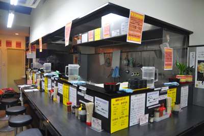 清潔感のある店内は、カウンター席のみ。床が滑ることもなく、こげ茶の壁にはハンガーの用意もあり、女性も入りやすい雰囲気だ。食券機は入口の左側に。