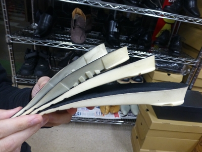 靴の中に入っているインソール(中敷き)が「背が高くなる」秘密。普通の靴にかかとの高いインソールを入れればそれでいい、というわけではなく、ここの靴は独自の技術で靴の型を作り、底が厚くなっていても見た目に分からないようなデザインにしている。また、インソールに厚みがあるので固いと歩きにくくなってしまうためできるだけ柔らかく、そして軽くして歩きやすさを追求しているそう。