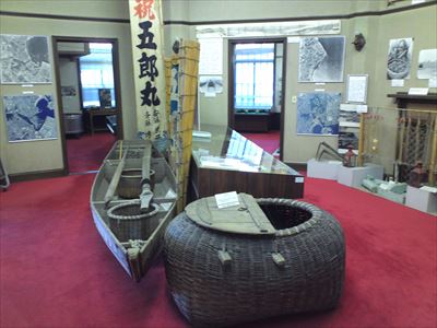 昔はこのような舟や漁具で海に繰り出したのである(八聖殿郷土資料館の展示)
