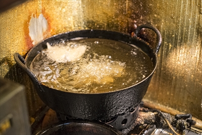 ビールを飲みながらフライが揚がるのを待つ