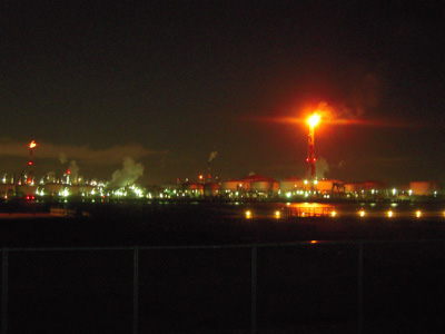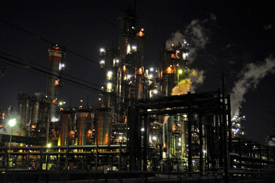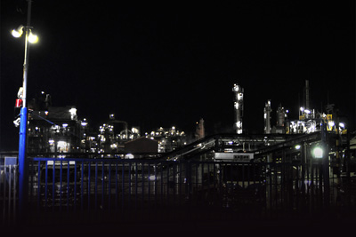 鉄塔の光を浴び、プラント群が赤く浮かび上がる