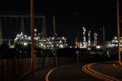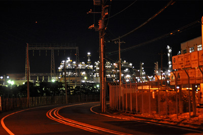 左手に日本ユニカーの建物があるところで、右手に折れると道は急カーブに。その先に巨大宇宙船が現れるかのように、工場が浮かび上がった。