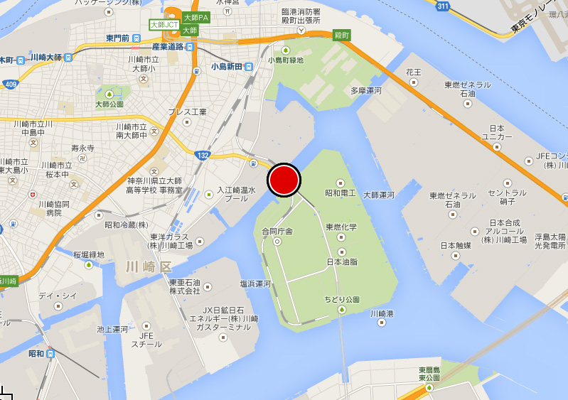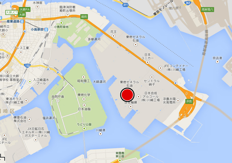 首都高速神奈川6号線に沿った国道409号線を走ると、東燃ゼネラル石油やJFEコンテイナーの工場やプラントが見えてきた。高いビル群や住宅が極端に少なくなり、工場萌えの雰囲気が徐々に高まってくる。