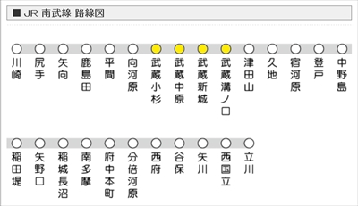 川崎方面から武蔵小杉、武蔵中原、武蔵新城、武蔵溝ノ口と続く。