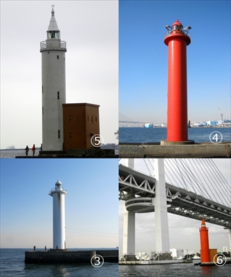(左から時計回りに)横浜外防波堤南灯台(5)横浜大黒防波堤西灯台(4)横浜外防波堤北灯台(6)横浜本牧防波堤灯台(3)。
