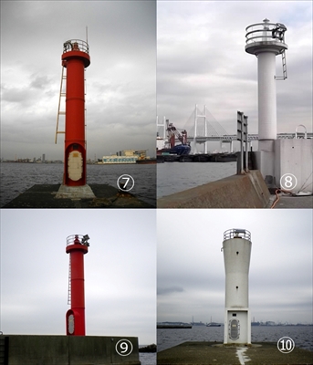 (左から時計回りに)横浜大黒ふ頭船だまり波除堤灯台(7)横浜貯木場防波堤灯台(8) 横浜金沢木材ふとう東防波堤灯台(10)横浜本牧砂利ふとう防波堤灯台(9)。