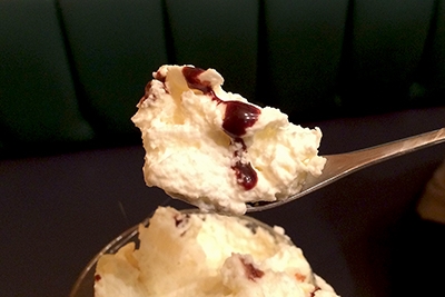 食べにくい形状に苦戦しながらもなんとかシュクル・フィレを食べ終えると、次に待ち構えていたのはアーモンドとチョコレートソースのかかった生クリーム。うぅぅ、苦手な生クリーム・・・意を決して口に押し込む。