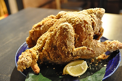 「鶏の丸揚げ(1985円)」は同店のオリジナルで、「骨つきもも焼き」以外にも鶏料理を提供したいと考案している最中、食の感動とインパクトを与えるメニューとしてひらめいたそうだ。